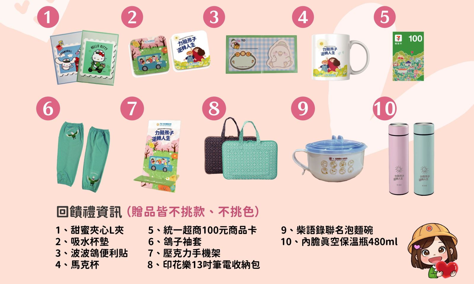 - 本活動贈品以實物為準,贈品若遇兌罄,普仁青年關懷基金會與中華郵政有權以等值贈品替代,恕不另行通知。